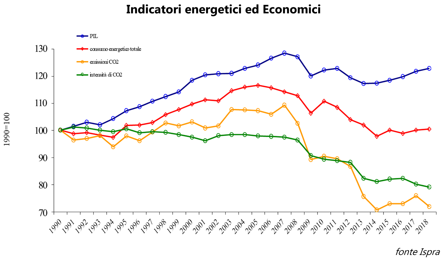 È positivo il trend delle emissioni di gas serra degli ultimi 28 anni. Nel 2018, le emissioni diminuiscono del 17% rispetto al 1990, passando da 516 a 428 milioni di tonnellate di CO2 equivalente e dello 0,9% rispetto all'anno precedente.
